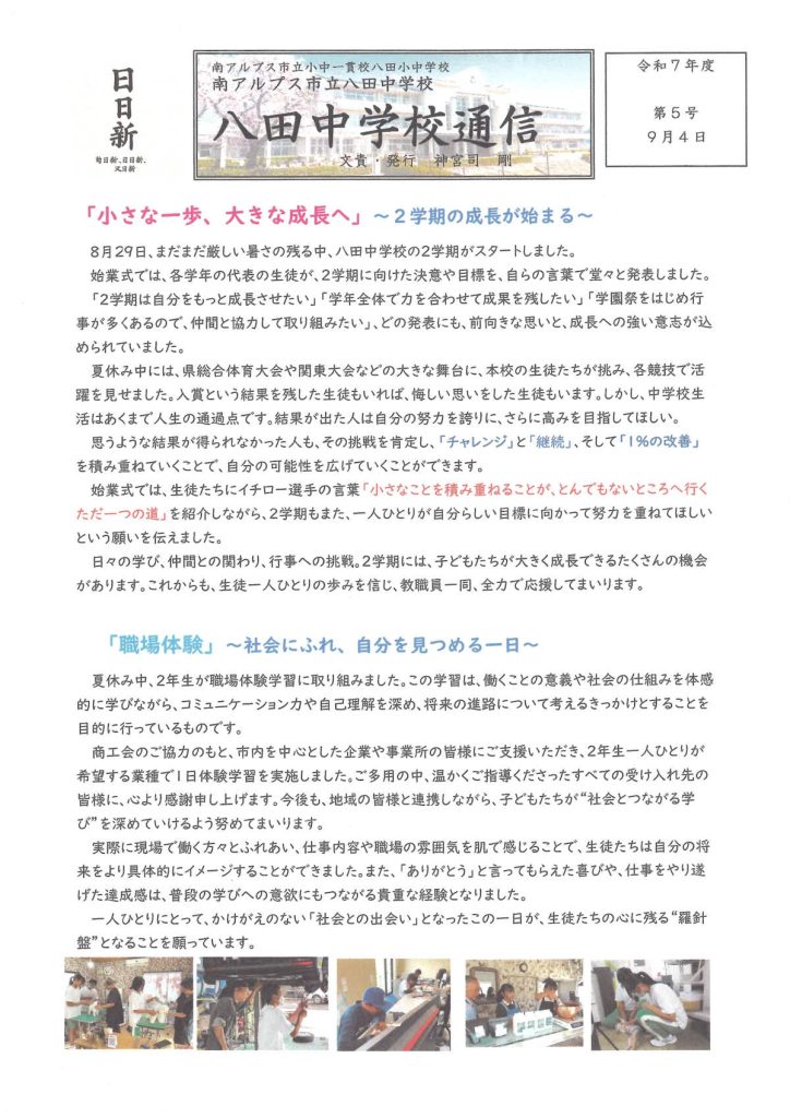 [八田中学校]八田中学校学校だより(令和7年度No.5・R7年9月号)