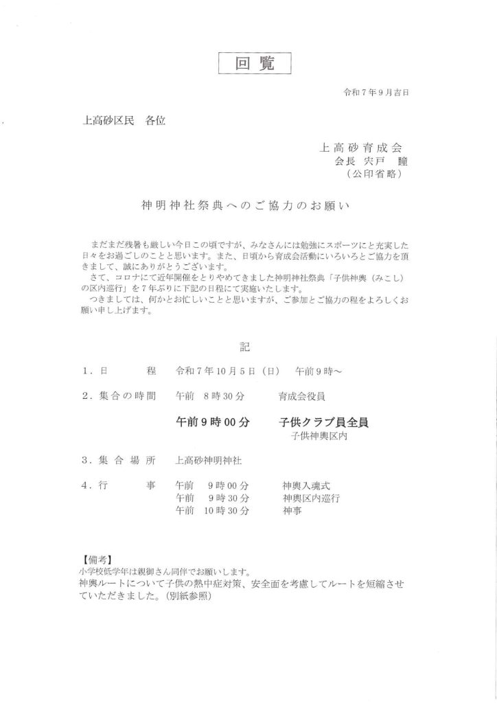 [上高砂育成会]神明神社祭典への協力について(子供神輿の巡行)